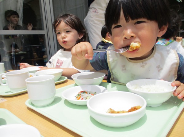 ぽかぽか心地良い空気を感じながら、友達や保育者と一緒に食事を楽しむ姿が見られました。