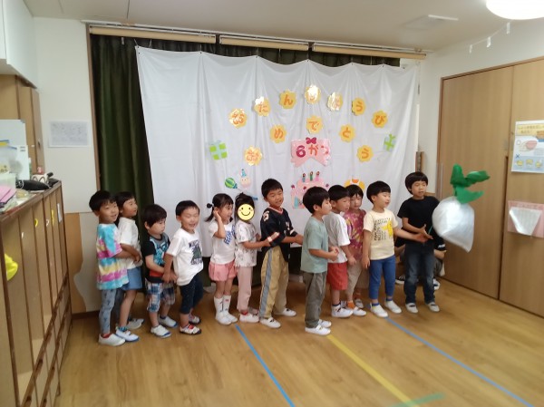 誕生会で「おおきなかぶ」の劇を発表したあと、畑に行きました。