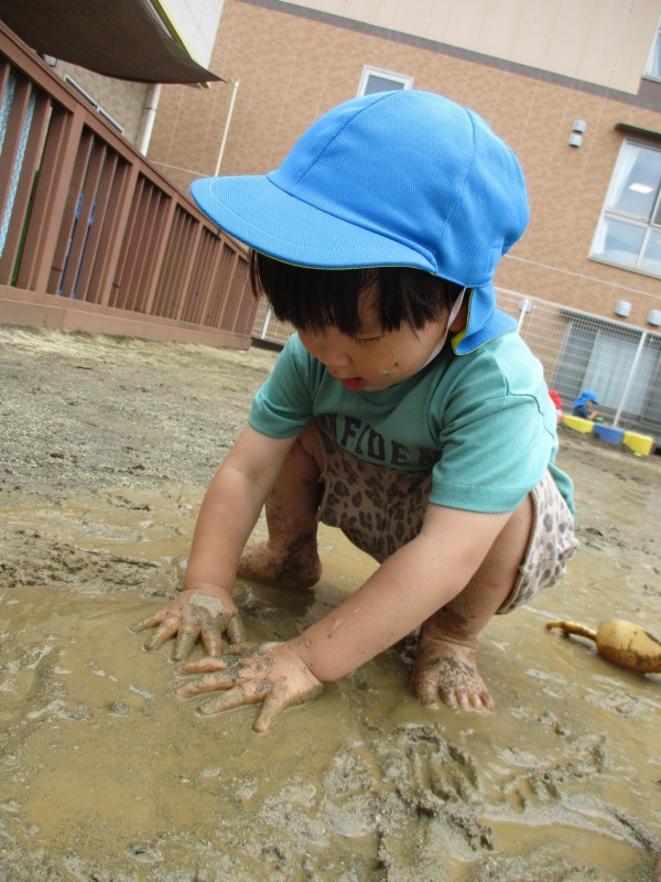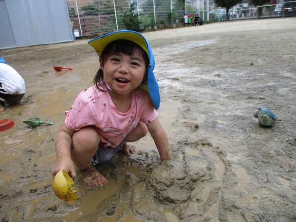 6月~7月のジメジメと蒸し暑いお天気の中、泥や砂や水の感触を楽しみ、元気いっぱい遊ぶ様子をお見せします。