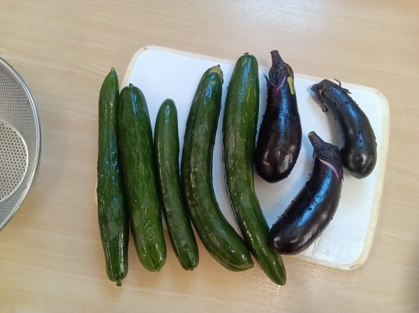 畑に行って、水やりとキュウリ・ナスの収穫をしました。