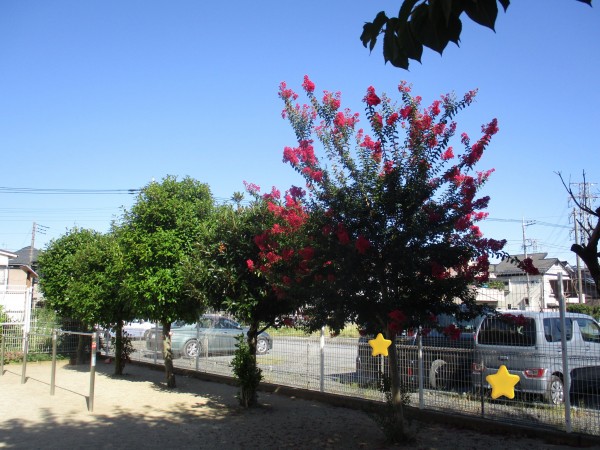 こどもの家・志木中宗岡には、駐車場に2本、園庭に1本のサルスベリの木が植えられており、真っ赤な花が満開です。