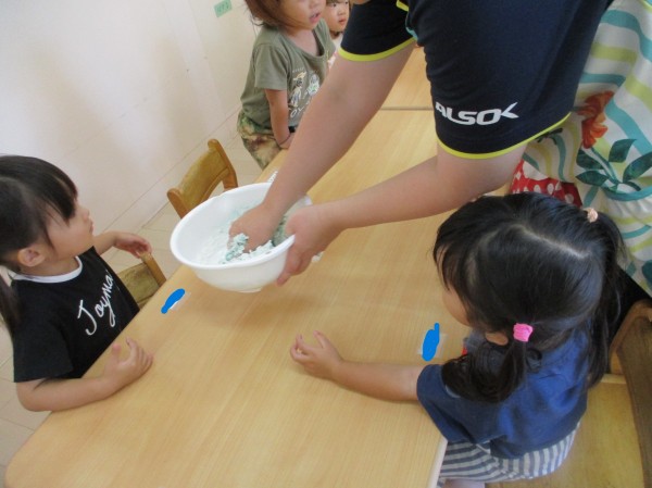 まずは、水を入れる前のふわふわの粉もちょんちょんと触ってみました。思わず触れた指を確認する子も・・・。