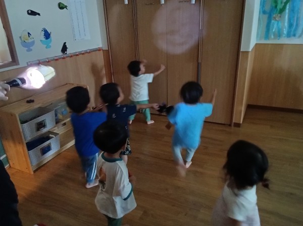 お部屋を暗くして、おばけの絵をライトに照らして陰を作りました。
