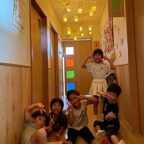 おやつ後に2階の廊下を暗くして、夏フェスで作ったランタンに灯りをつけました。