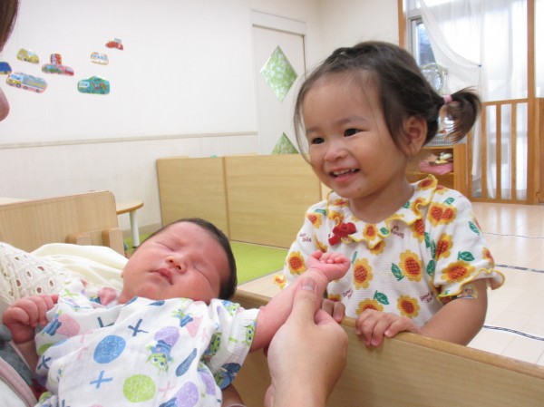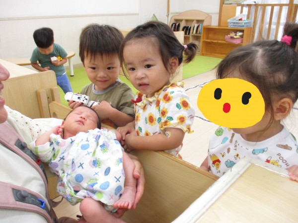 お盆中のある日、産休中の先生が生まれたてほやほやのちっちゃなあかちゃんを連れて保育園に遊びに来てくれました。
