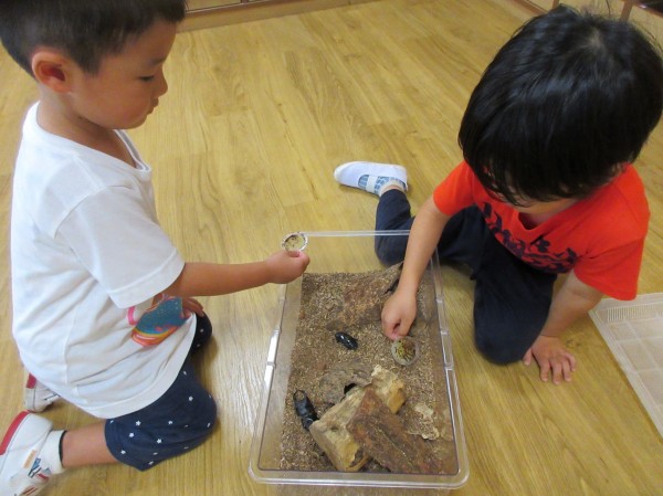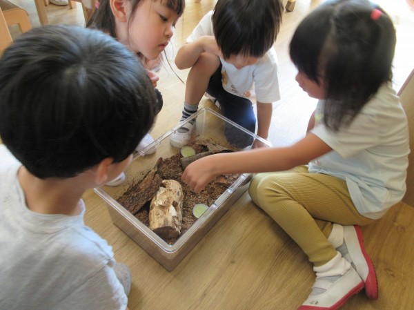 クワガタを見せると大喜びし「先生!触ってもいい?」「ゼリーをあげてもいい?」等と、子どもたちは興味津々です!(^^)!