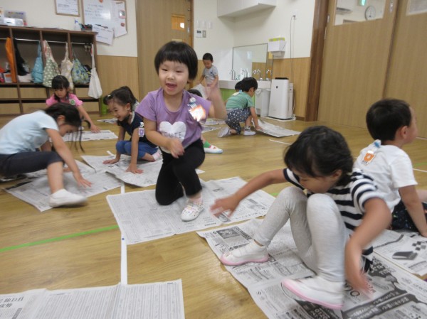 先日の雨の日、幼児組では新聞紙を使って見立て遊びを行いました。タイトルは「ピクニック」です!