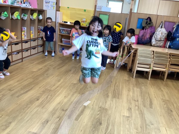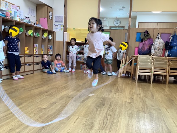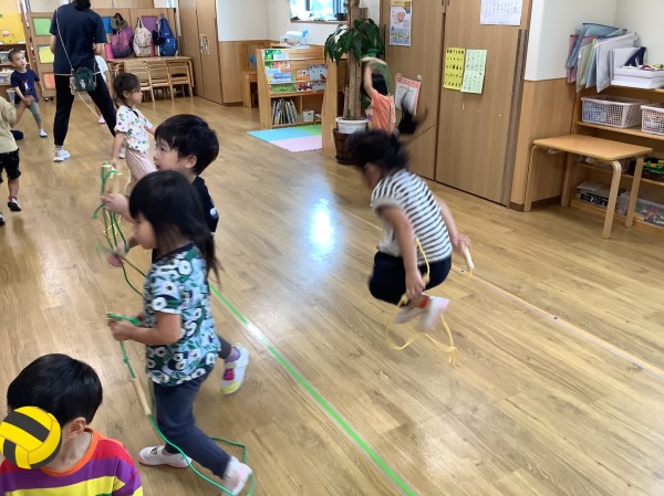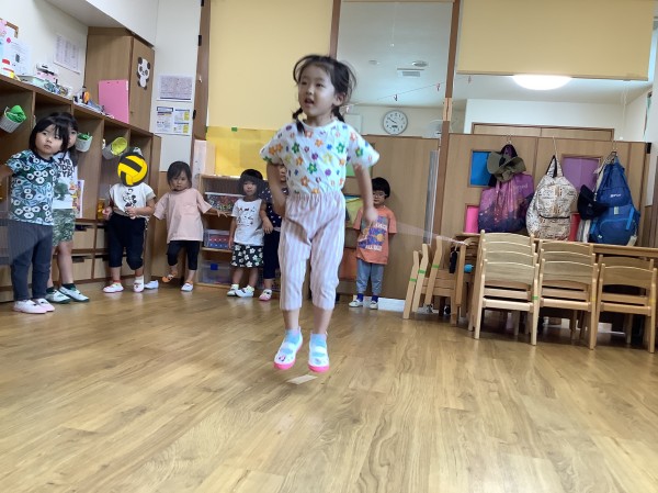 今日はあいにくの空模様だったため、室内で運動遊びをしました。長縄と短縄を準備しておくと「やってみたい!」と手に取り、意欲的に挑戦しようとする姿が見られました。長縄はこれまでに何度も取り組んでいたこともあり、連続で跳べる子が増えてきました。その他にも室内での運動遊びに取り組む子どもたちの様子をご覧ください。