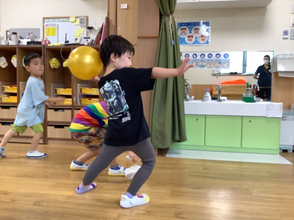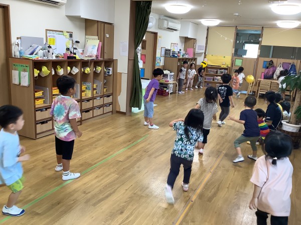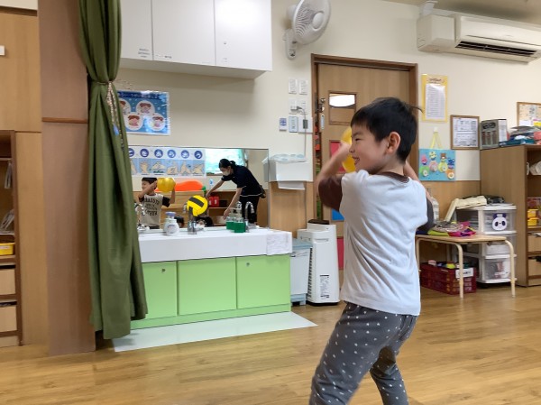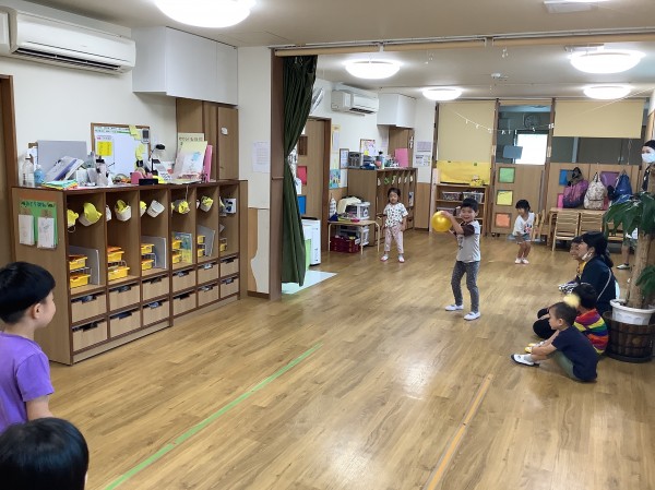 はじめは片手投げが上手くいかず苦戦している子もいましたが、何度も練習する姿が見られました。子どもたちが主体的に遊ぶ中でも、保育者がちょっとしたヒントやコツを伝えるだけで遊びはどんどん発展していきます。涼しくなったら、広い公園でも運動遊びを沢山取り入れていこうと思っています。