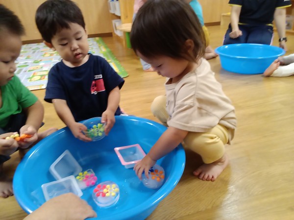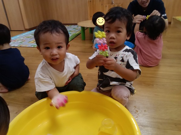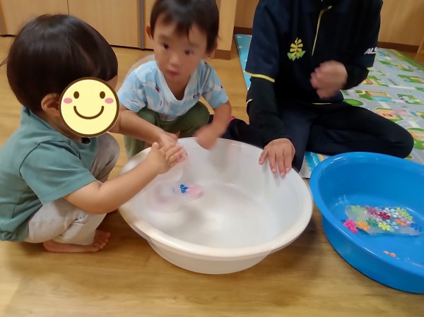 氷の中にお花のおもちゃが入っているのに気が付いて、興味津々!冷たいので、そーっと触る子もいれば、気にせずにダイナミックに持ち上げて別のタライに移したりと、さまざまな姿が見られました。