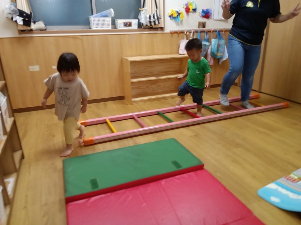 二段になっている巧技台を両足ジャンプで降りることができるようになってきました。滑り台を滑ったり、はしごを様々な体勢で渡ったりして、たくさん体を動かして遊びました。