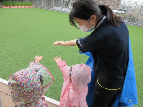 雨粒が体に当たる度に、保育者や友達と顔を見合わせて大喜びする子どもたちでした!