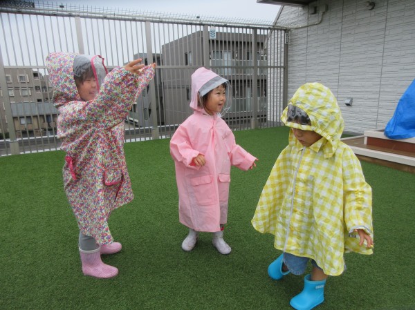 雨の日、レインコートと長靴を履いて屋上に出てみました。音を聞いたり雨粒を触ってみたりしながら、雨を全身で感じました。