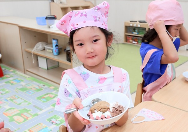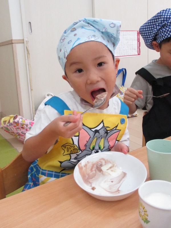 「アイスが溶けちゃう!」「つめたい!」「おいしい!」とパクパク食べて、嬉しそうなお顔( *´艸`)