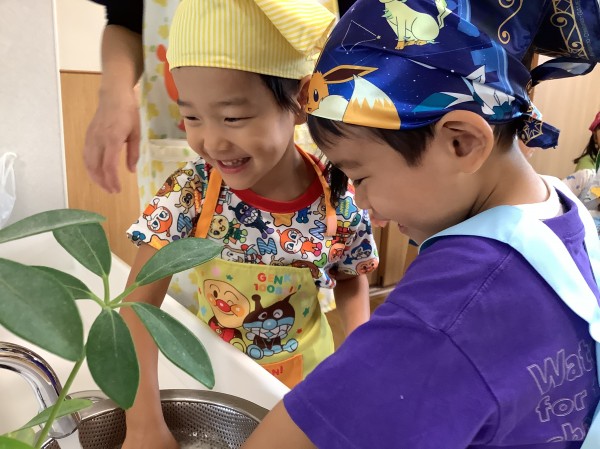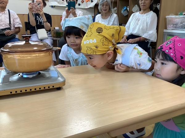 お米を丁寧に研いで、透明な鍋で炊きました。ぐつぐつ炊けていくのを見ていましたが、沸騰してお湯がこぼれると「火事になっちゃうよ!」と慌てる子もいました。