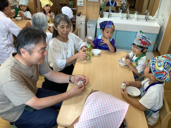 炊けたご飯をラップで握っておにぎりを作りました。おじいちゃん・おばあちゃんと一緒に食べました。どのテーブルも、「おいしいね」と笑顔で会話しながら食べる様子が見られました。