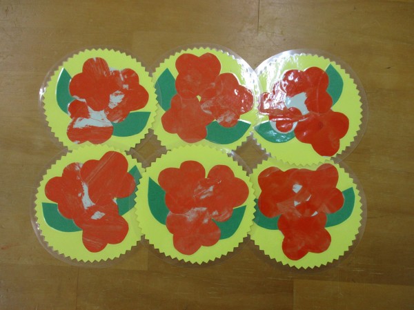 保育者がお花の形に切り取って、葉っぱと一緒に貼ると…