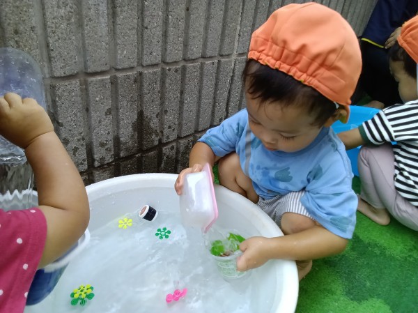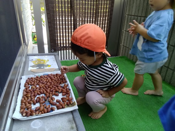 幼児組から借りてきたドングリを使って水遊びをしました。