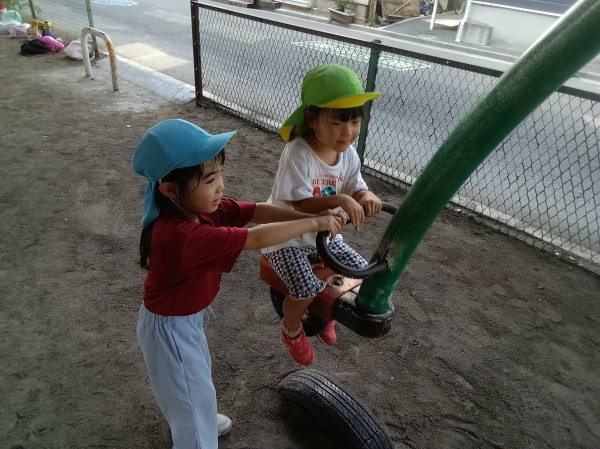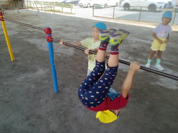 鉄棒の練習を頑張りました。自分の目線よりも高い鉄棒で逆上がりができるのか、何回も挑戦していました。シーソーではせっせとぱんだ組のお世話をするぞう組の姿が見られました。