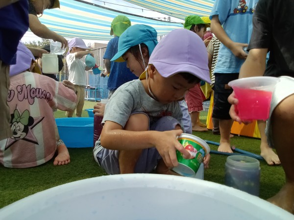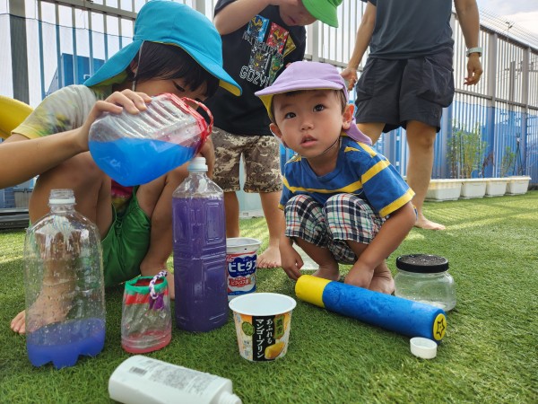 屋上に行ってみると、幼児組のお友だちがたくさん!色水遊びやプール遊びをしていたので、一緒に遊びました。お兄さんたちが作った色水を興味津々に見ていて、自分だちでも色を混ぜて作って楽しんでいました。