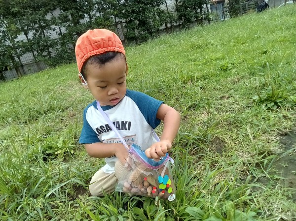 以前作ったお散歩バッグを首から下げて、公園にお散歩に行きました。お散歩バッグを持っていることで、いつも以上に歩く気持ちが高まり、全員が歩いて出発することができました。公園に着くとどんぐりや葉っぱがたくさん落ちていて、うれしそうに自分のバッグの中に入れていました。