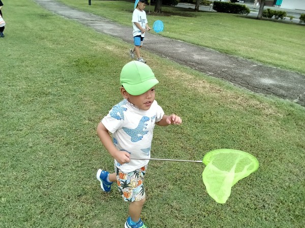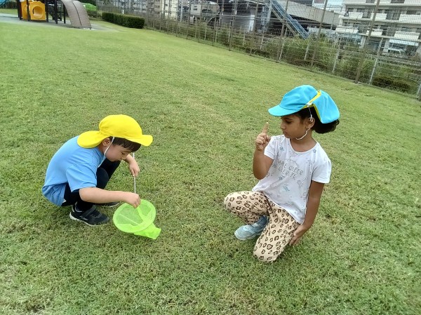 公園に行く前は「縄跳び頑張るんだ~」と張りきっていたのですが、公園に着いた子どもたちの目に飛び込んできたトンボの大群。「あ~網持ってくればよかった…」と残念そうにしていた子どもたちに「実は…ちゃんと持ってきました~!」と網を見せると「うぉ~!先生、さすが!!」と大興奮。早速、網を手に取り、トンボを捕獲すべく、公園中を右へ左へ走り回っていました。しかし、緩急をつけて飛び回るトンボに翻弄される子どもたち…そこで、みんなで作戦会議。「静かにした方がいいんじゃない?」「追いかけるんじゃなくて、来るのを待つのはどう?」と意見を出し合いました。作戦会議のかいもあり、2匹のトンボを捕まえることに成功しました。捕まえたトンボを見ていると「あれ?色が違う?」「2匹は違う種類のトンボなのかも…」と気づいたので、保育園に連れて帰り、図鑑と見比べながらトンボの種類も調査しました。