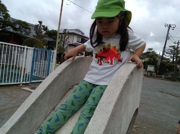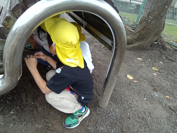 神社へ出発する前、「龍神社で白いキレイな石を探してきて!」というミッションをもらった子どもたち。「そんなのないよ~」「よ~し!ゼッタイに見つけよう!」と言いながら出発しました。久しぶりの龍神社では、回転ジャングルジム、すべり台、ブランコなどの遊具で遊んだり、本日のミッションをクリアしようと石を探したり、かくれんぼなど、好きな遊びを楽しみました。「こんなキレイな石あったよ~!」「こっちも見て~!」「いいな~、石見つけたいな~」と言いながら一生懸命に探している子どもたちでした。