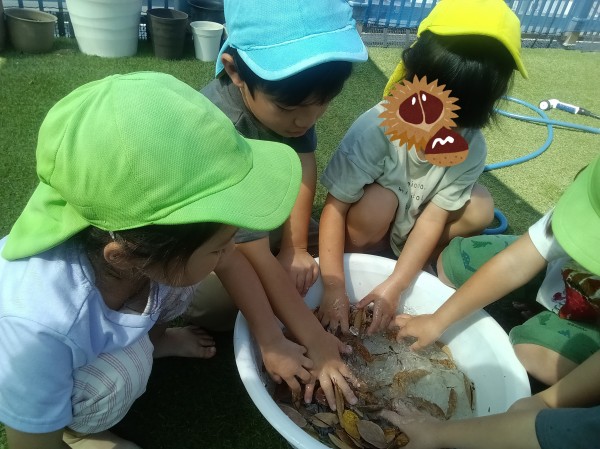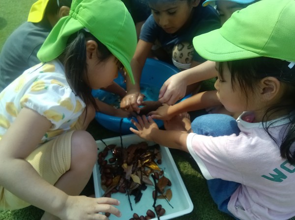 秋のアート遊びで使うために、以前拾ってきた落ち葉や枝、ドングリを水で洗いました。「これ洗ってどうするの?」「どうやって遊ぶんだろう」と秋のアート遊びを楽しみにしている姿も多く見られました。