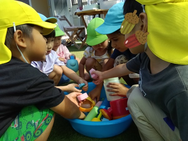 夏の間お世話になった水遊び用の玩具をスポンジで擦って洗ったり、水鉄砲の中の水を出したりして干しました。「これ、楽しかったよね~」と水遊びの思い出話に花が咲いていました。