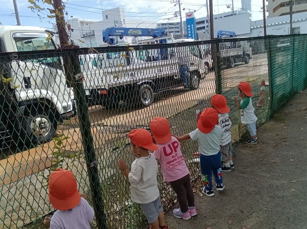 今日は、今までで一番遠い公園に散歩に行きました。歩き遠足に向けての練習も兼ねてみんなで歩いてみましたが、全員無事に歩いて行くことが出来ました!乗り物のカードを保育者が見せると歩く気持ちが高まって、「パトカーいるかな」「トラック見えるかな」とお話をしながら歩いていくと、いつの間にか公園へ到着することができました。