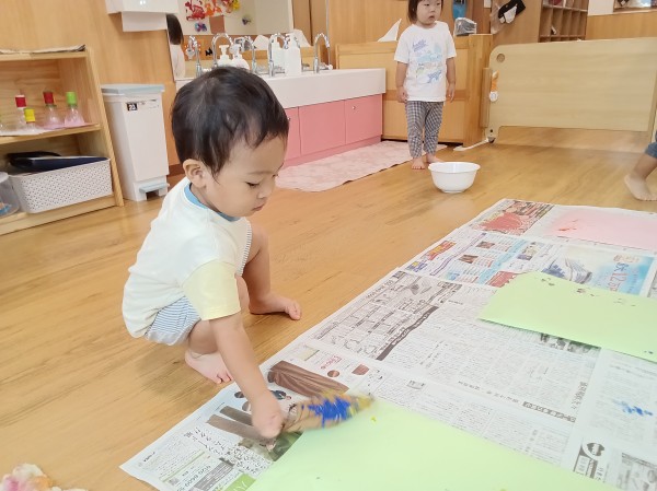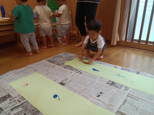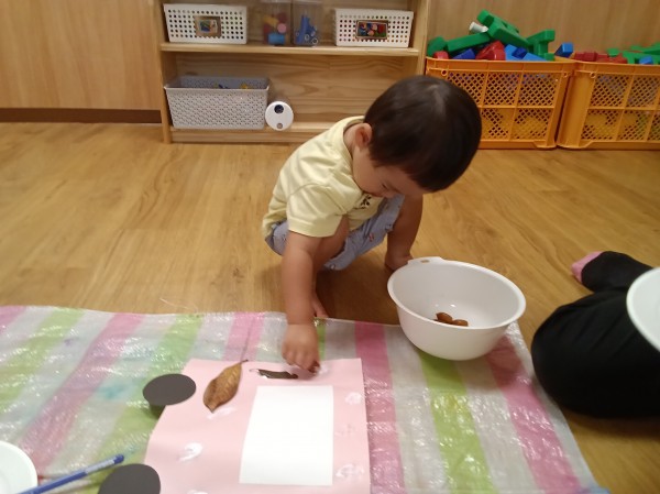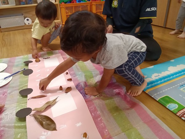 ドングリや葉っぱを貼り付けるチームと葉っぱに絵の具を着けて模造紙に色付けしていくチームの2つに分かれて、秋の自然物に触れていきました。葉っぱに絵の具が付くと不思議そうに見つめていた子どもたち。自由に模造紙に色をつけていき、好きな色を言いながら楽しんで遊んでいました。
