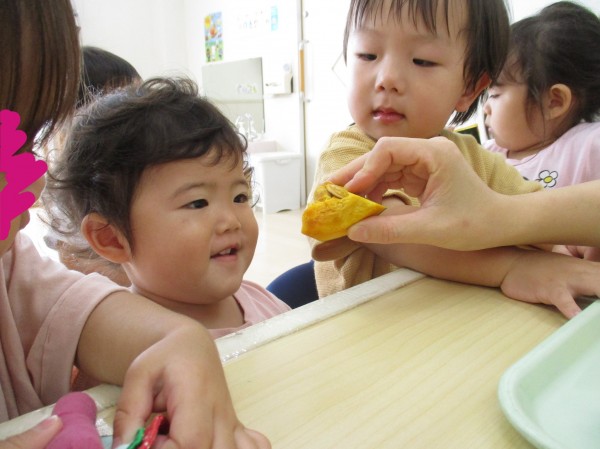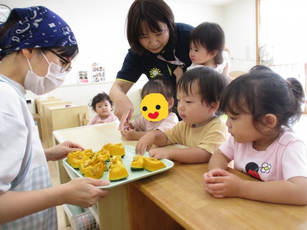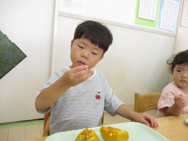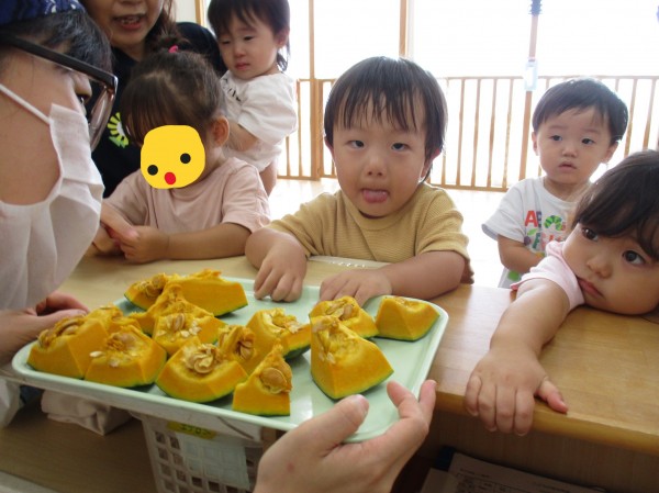 こどもの家・志木中宗岡 食育☆かぼちゃの種取り あひる組(1歳児)