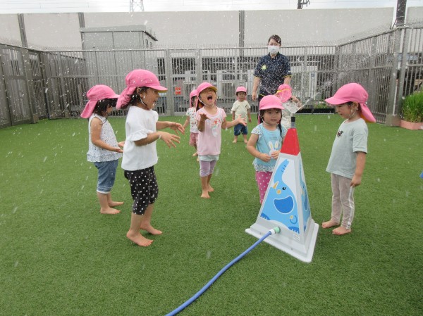 今年は新しい水遊びアイテム「ぞうさんの噴水」を取り入れ、今まで以上に水に触れたり浴びたりすることを楽しんでいる子どもたちです!(^^)!