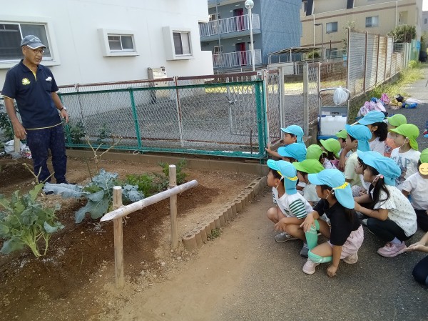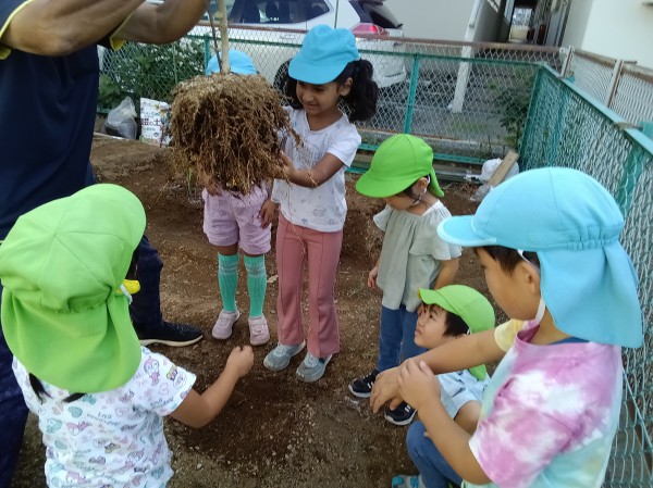 畑で、収穫を終えた「ナス」をすべて抜き取りました。「ぱんだ組とぞう組さんで6人組をつくろう!」と言うと、子どもたち同士で「こっちにまだ入れるよ~!」「6人そろったよね。1,2.3.…」などと言いながら保育者の手を借りずに6人組を作ることができました!チームごとに力を合わせて無事にナスを引っこ抜くことができました。「こんなに(根っこが)もじゃもじゃしてたね」「虫さんはいなかったね」と感想を言い合っていました。