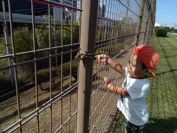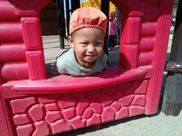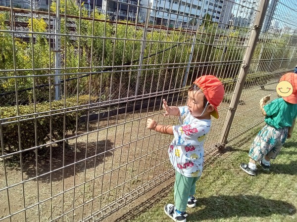 今日は、お友だちや保育者と手を繋いで公園へ行きました。公園まで初めてバギーを使わずに向かうことができました。公園では、フェンス越しに大きな電車を見たり、保育者と一緒に追いかけっこを楽しむりす組さん。また大型遊具の滑り台に腰掛けたり、トンネルのなかをくぐったり、ままごとコーナで小石や小枝を手渡してお店屋さんごっこを楽しむ姿がありました。帰りも、疲れた様子はありましたが保育者に励まされながら園まで歩いて帰ることができました。