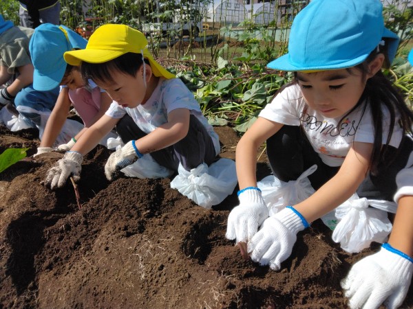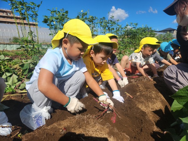 今日は、楽しみにしていたお芋ほりでした。お部屋で、自助バッグに水筒、ビニール袋、軍手などを入れて、早々と準備が完了していた子どもたち。予定の時間前に無事保育園を出発することができました。畑では、1人2株のサツマイモを担当することになり、自分の目の前のさつまいもを丁寧に掘りました。「あ、ダンゴムシ!」「こっちに、へんな虫がいたよ~」「こっちは、ふたごのおイモだ~」「なんだか大きすぎてぜんぜん出てこないよ~」などとあちこちから子どもたちの楽しそうな声が聞こえてきました。お友だちのおイモを一緒に掘ってあげたり、軍手をはずすお手伝いをしたりと、協力しあう姿もたくさん見られたきりん組とぞう組です。往復100分の道のり(1万256歩)を頑張って歩きました!