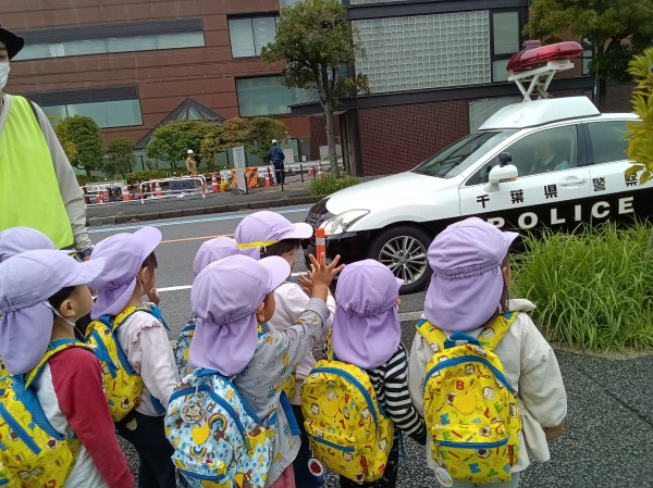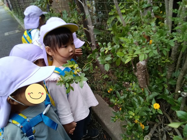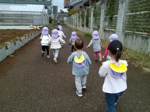 の緑道までお散歩に行きました。着くなり「リレーしようよ!」と元気いっぱいの子どもたち。保育者と鬼ごっこをしたり、お友だちと競争をして楽しみました。散歩中、「今日はピンクと黄色と紫のお花見つけたね」「白いのもあったよ!」と道に咲く花たちの色を観察しながらも、「今日の給食なんだっけ?」とお腹が空いてしまった様子のうさぎ組さんでした。
