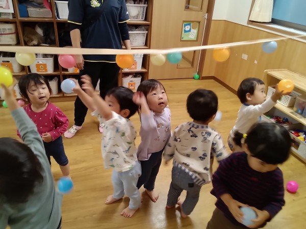 今日は、運動会の予行練習があり、保育者と一緒に走ったり親子競技の練習をしました。いつもと異なる雰囲気に圧倒されるお友だちもいましたが、保育者と一緒だと安心した様子で楽しそうに参加していた子どもたちです。その後、お部屋で運動遊びコーナーとおままごとコーナーに分かれて遊びました。また、テープとソフトボールを使ってくっつけたり剥がしたりして遊びました。一所懸命腕を伸ばしたり背伸びをしたり…指先や全身を使いながら笑顔いっぱいで楽しむ子どもたちでした。