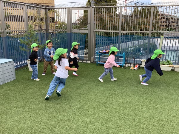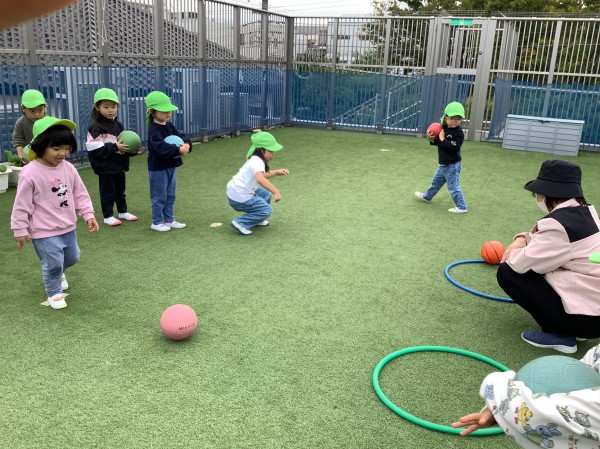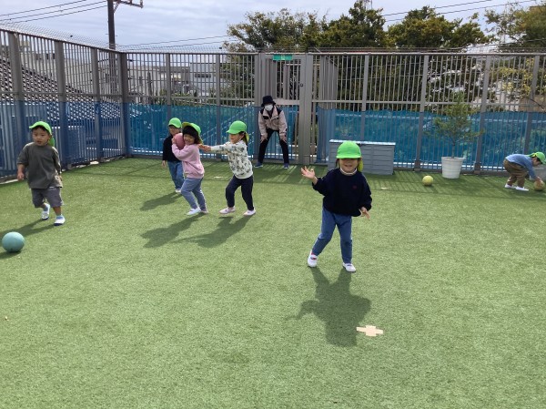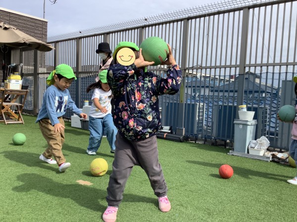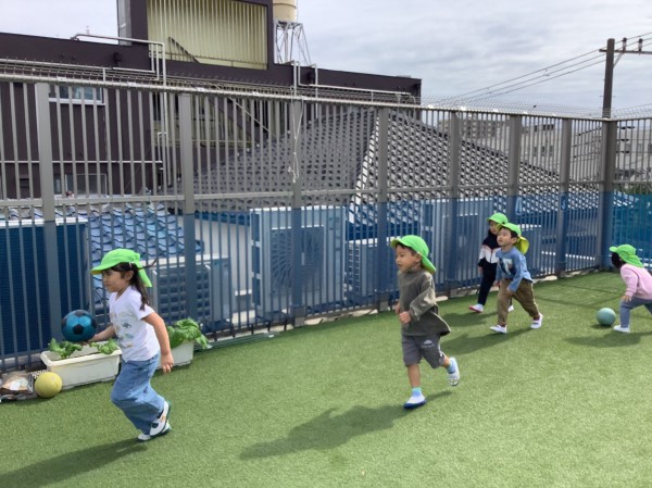 練習後は久しぶりに屋上で、ボールを使った運動遊びをしました。ボールを蹴ってフラフープに潜らせたり、上手投げや下手投げでボールを入れることに挑戦したり、苦戦しながらもとても楽しんでいました。最後はリクエストに答えて、保育者と氷鬼対決をしました。屋上中をたくさん走って回って、大興奮の子ども達でした。