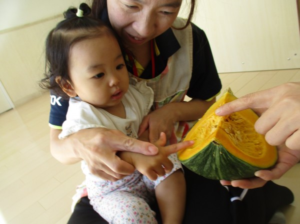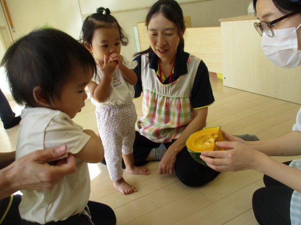 こどもの家・志木中宗岡 10月の食育 「かぼちゃに触れたよ☆」 たまご組(0歳児)