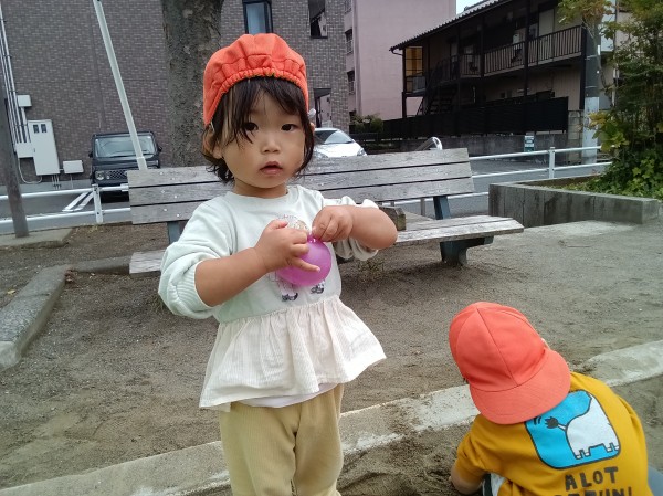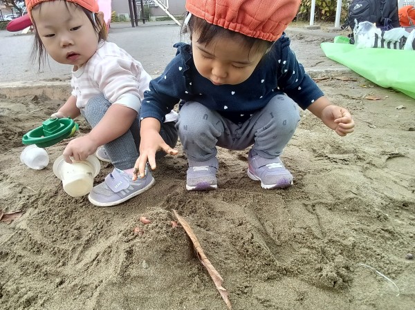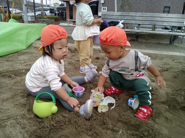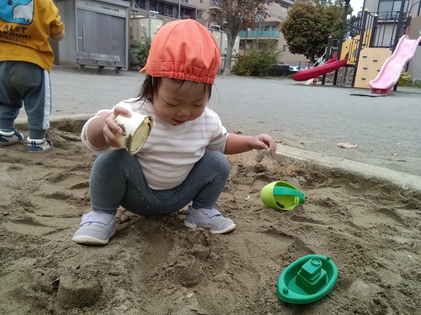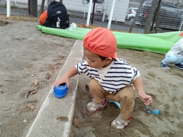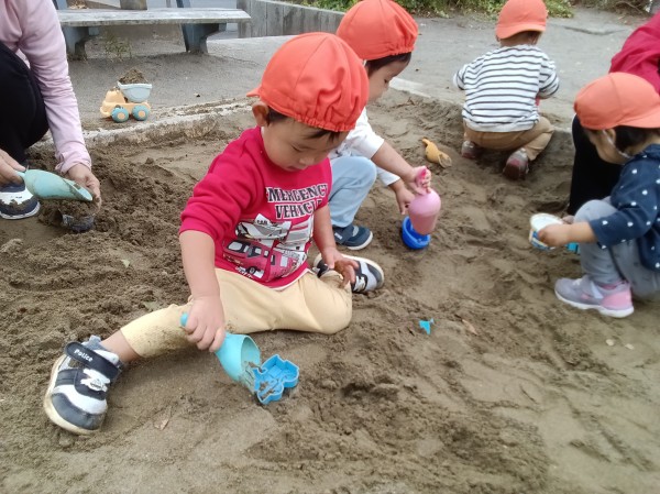 今日は、公園で遊びました。公園へ向かう途中、消防車が通ると嬉しそうに手を振る子どもたちでした。公園では砂遊びをしました。大好きな車や船のおもちゃに砂を入れて手で走らせたり、落ちていた木の実やどんぐりを使ってケーキを作るなどそれぞれ好きな遊びを楽しんでいました。今までは保育者と一対一で遊んだり、一人で夢中になって遊んでいましたが、少しずつお友だちの隣で同じ遊びをしたり、木の実をどうぞと手渡したりと、お友だちとの関わりが広がってきたようです。