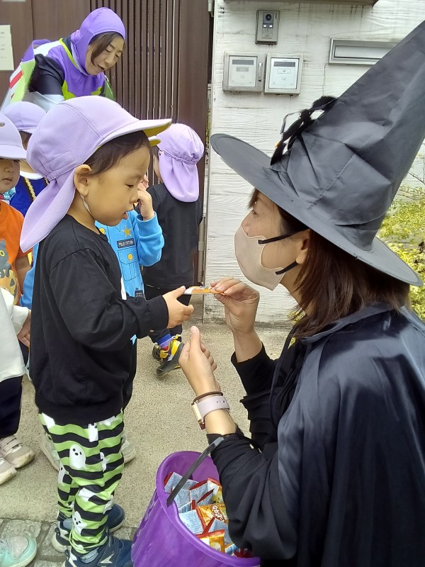 「トリックオアトリート!」と伝えて、お菓子を貰いました。