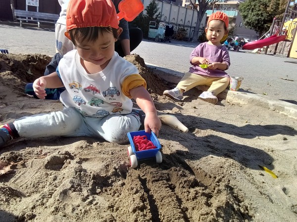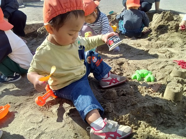 掘ったり、運んだり、砂を詰めてみたり‥砂遊びって楽しいね!
