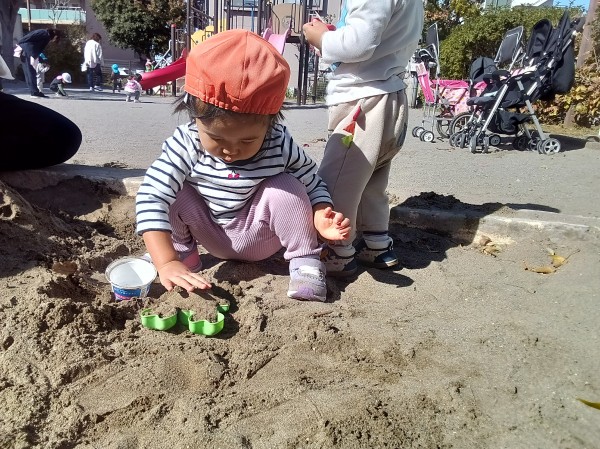今日は、小学校に向かって歩き線路沿いを通るルートでお散歩をしました。車の整備工場前を通ると車を見て嬉しそうに指をさしたり、道の途中にあるねこじゃらしや葉っぱなどに触れながら楽しく歩きました。山野町公園では、砂遊びを楽しんだ子どもたち。保育者が掘った砂の中に入ってお風呂ごっこを楽しんだり、カップを使って型抜きを繰り返し楽しむなど、保育者のそばで思い思いに過ごしました。また、遊具に登ってみたり、遊具周りで保育者と一緒に追いかけっこをしたり、地面にお絵かきをするなど色々な遊びを楽しんだりす組さんです。