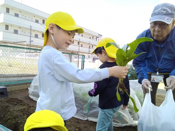 今日は3クラス合同で、公園へ散歩に行きました。【のぞみチーム】と【スーパーカーチーム】に分かれて、最後のリレー練習を行いました。保育者が声をかけるとすぐに自分のグループに移動して、【のぞみチーム】はビブスを着たりアンカーの子はたすきを身に付けたりと、とてもスムーズに準備することができました。入場してスタート地点に着くと、その場で駆け足しながら真っ直ぐに並ぶことにも慣れてきました。リレーがスタートすると、走っている友だちに声援を送りながらもリレーの時の約束も忘れず、スタートラインに移動したり前につめることができた子どもたち。両チームとも頑張り、途中で追い抜いたり追い抜かされたりと、最後は接戦となるとてもいい戦いになりました。結果は【のぞみチーム】の勝利となりましたが、負けてしまった【スーパーカーチーム】もとてもいい表情をしていました。その後は少し自由遊びをしてから、きりん組・ぞう組は畑へ行き【ほうれん草の収穫】をし、ぱんだ組は保育園に戻って【パラバルーン】の練習を行いました。