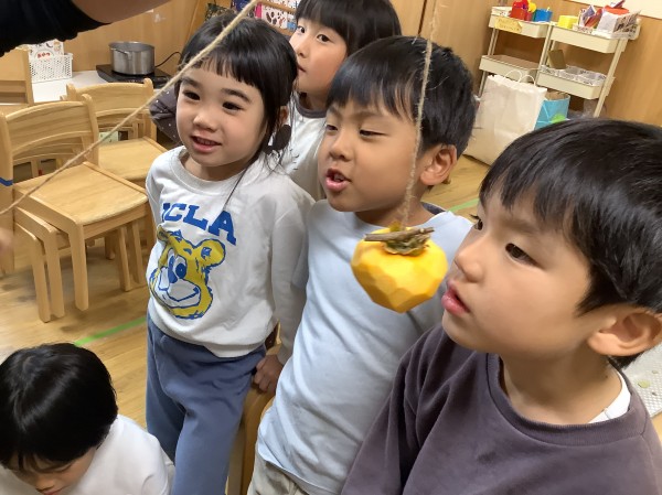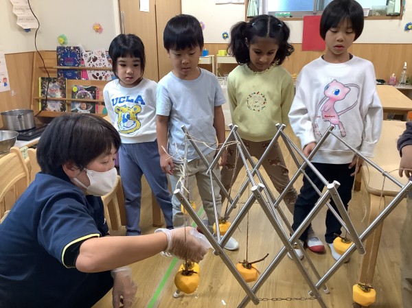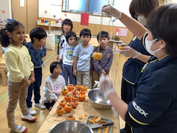 今年も去年に引き続き渋柿を地域の方から頂きました。早速干し柿作りをしようとぞう組の子ども達を誘うと大張り切り。柿の紐付けを頼むと夢中になって一つずつ丁寧に結びつけてくれました。「渋柿ってどんな味だろう?」と疑問の声があがったので、みんなで皮を舐めて味見をしてみました。「柿と同じ味だよ」と話しているとだんだん渋みが口に広がりびっくり!普通の柿との違いも知ることができました。また何故熱湯消毒をするのか、お酒を吹きかけるのかについても話しを聞き、知ることができました。