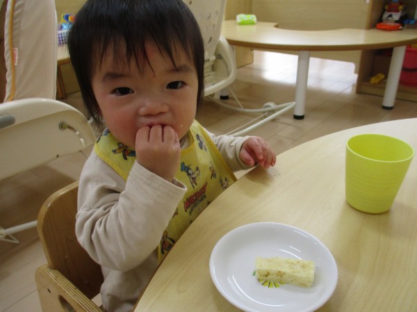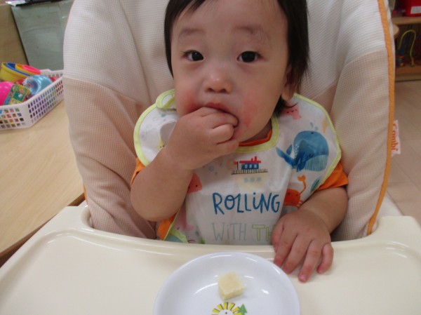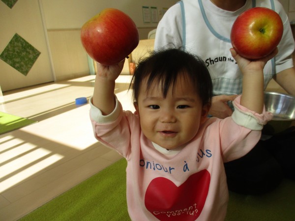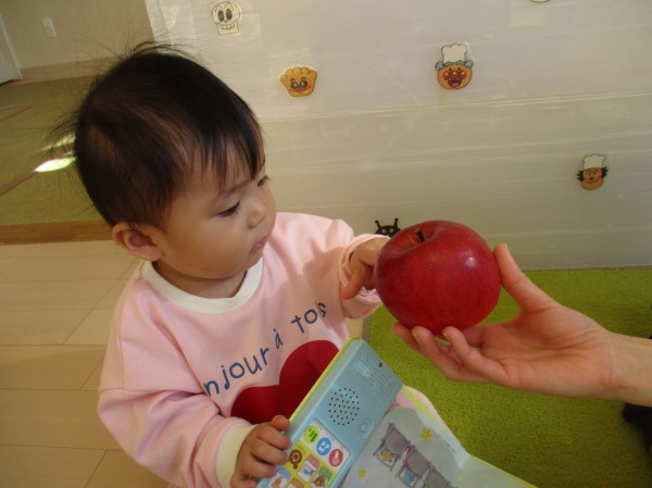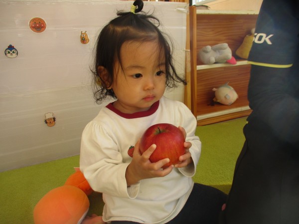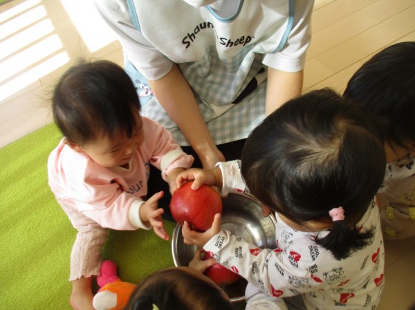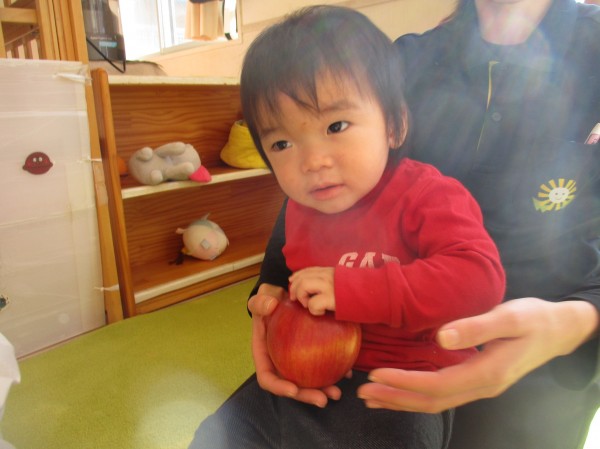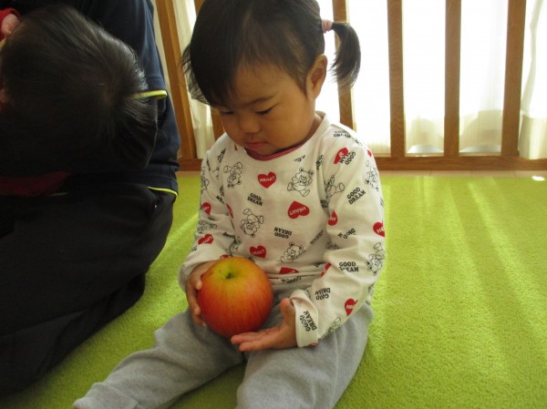 月に1回、食育として野菜などに触れているたまご組。今回はりんごに触ってみました!