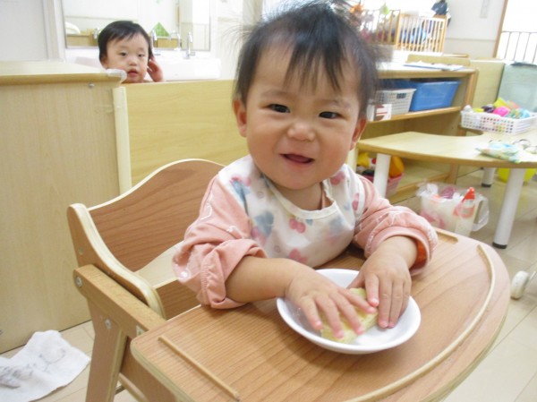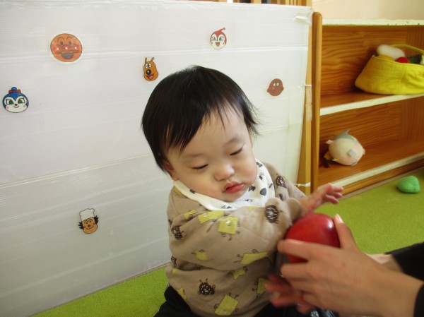 こどもの家・志木中宗岡 りんごを触ったよ♡たまご組(0歳児クラス)