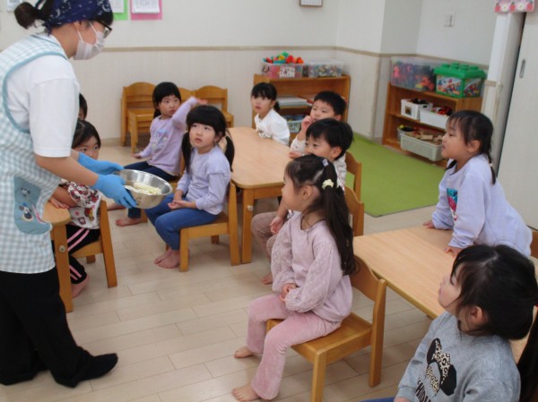 今月の食育は【きのこほぐし】丁度みんなでキノコの歌を歌っているので口ずさみながら
