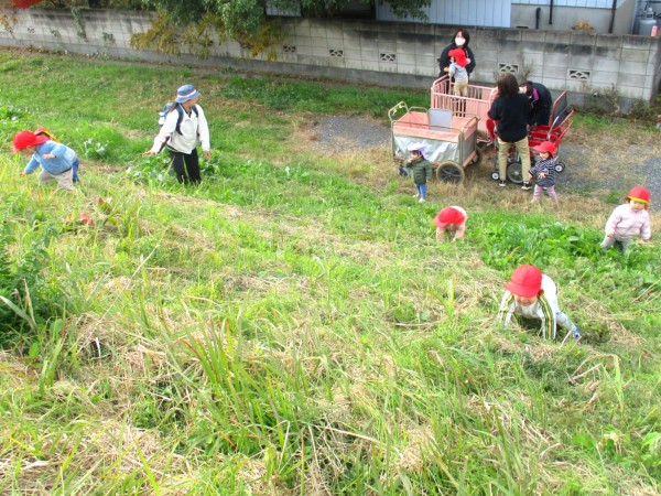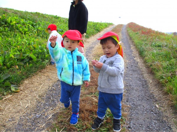 秋晴れの心地よい日、あひる組は散歩に出かけました。